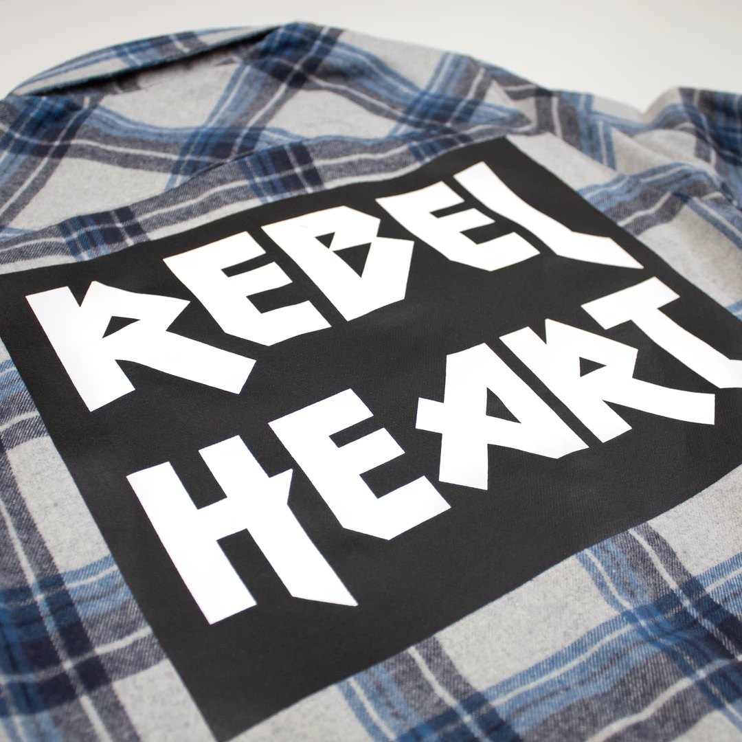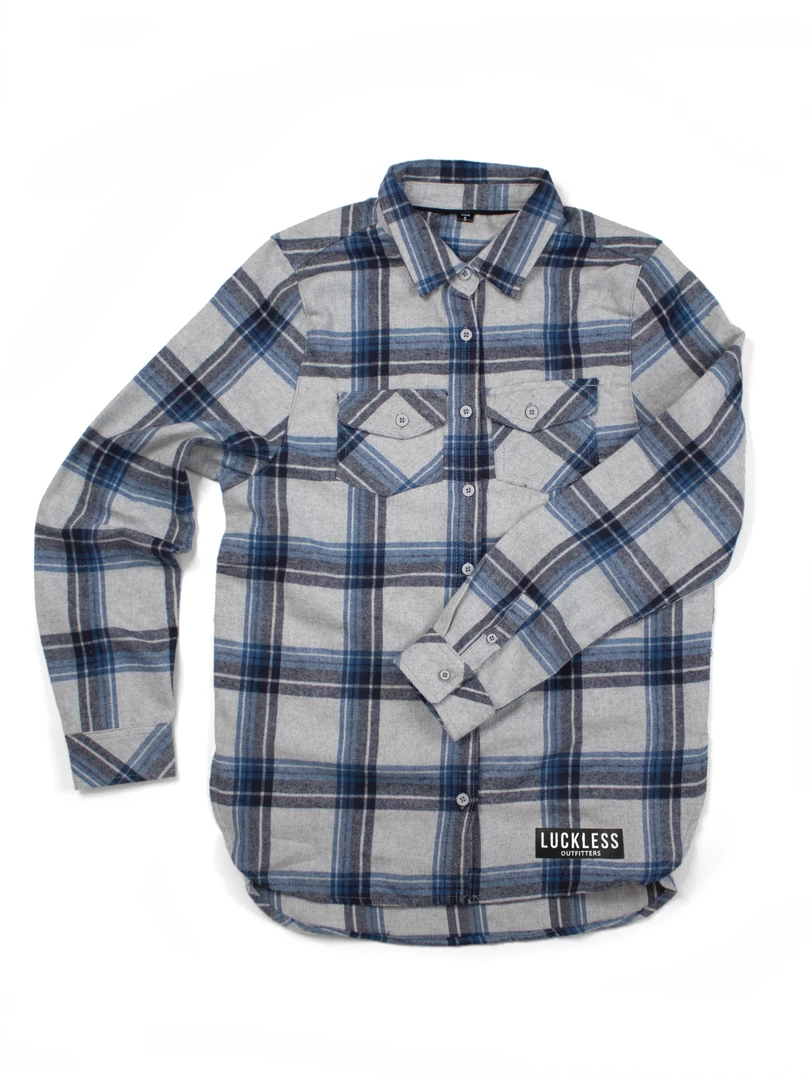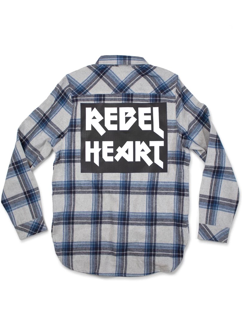 Ladies fit. This Blue/Gray Plaid boyfriend style flannel features a large back print in black and white. Definitely gives off alternative vibes.
