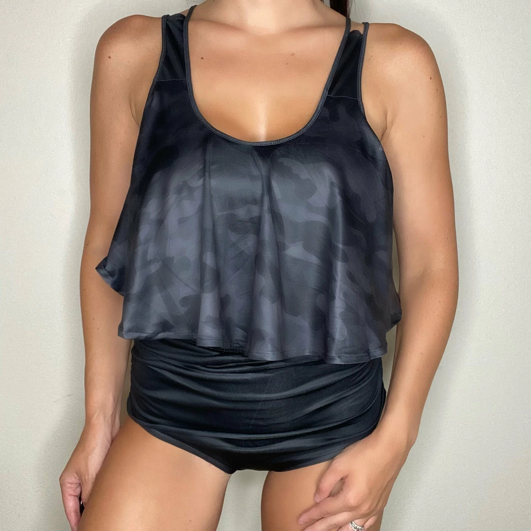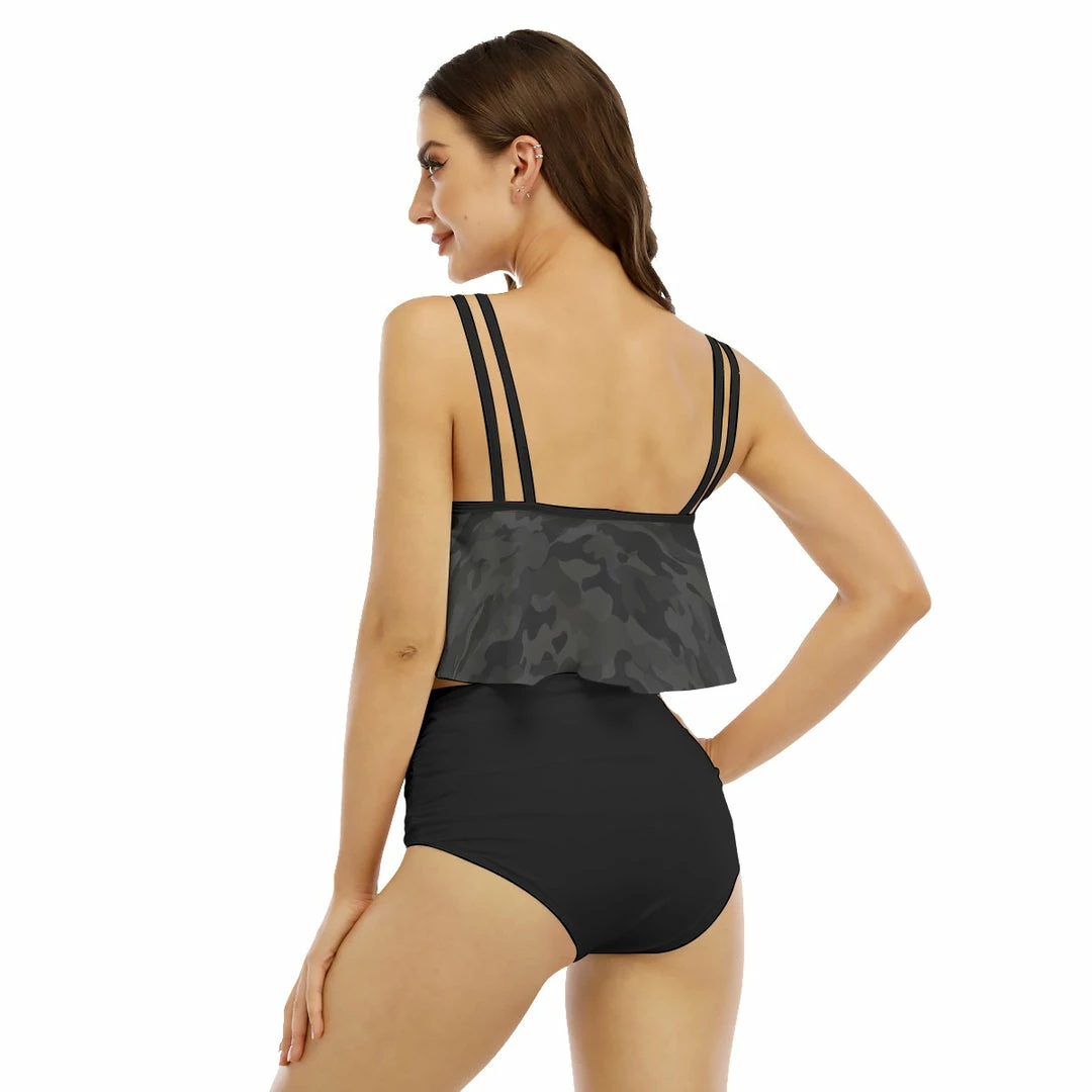 Sexy two-piece bikini with ruffles on the top, suspender top and lining at the bottom