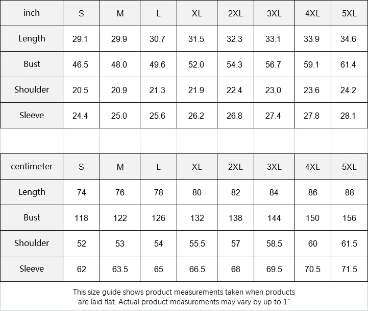 | inch | S | M | L | XL | 2XL | 3XL | 4XL | 5XL |