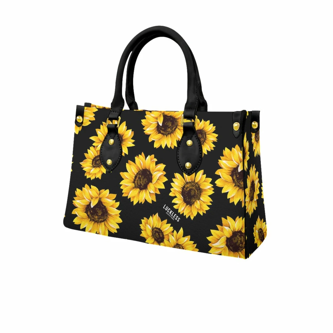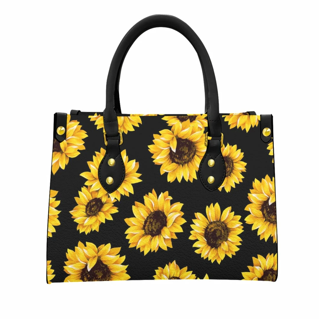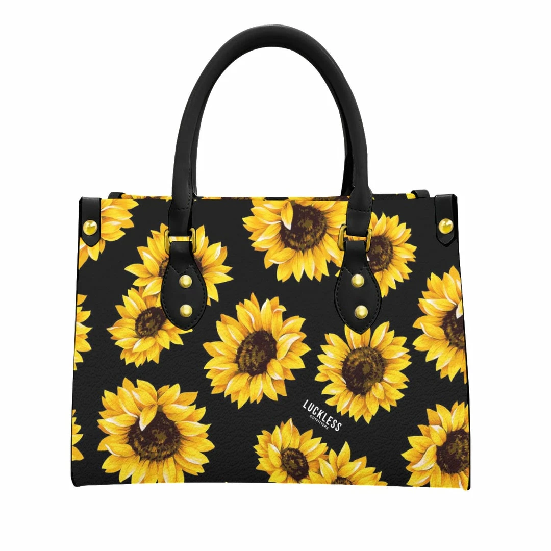 - This elegant handbag features our popular sunflower pattern and black straps. Two inside pockets help with organizing. One pocket is zippered. Matches perfectly with all of our sunflower items, a must have to complete the look!